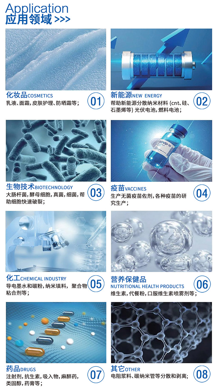 化學(xué)工業(yè):在化學(xué)工業(yè)中,超高壓均質(zhì)機(jī)可用于納米材料的制備、涂料和顏料的生產(chǎn)等方面。通過(guò)高壓均質(zhì)處理,可以改善材料的分散性和穩(wěn)定性,提高產(chǎn)品質(zhì)量和性能。