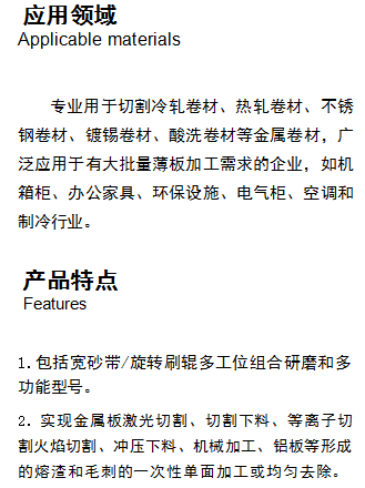 產(chǎn)品介紹:實(shí)現(xiàn)金屬板激光切割、切割下料、等離子切 割火焰切割、沖壓下料、機(jī)械加工、鋁板等形成 的熔渣和毛刺的一次性單面加工或均勻去除。